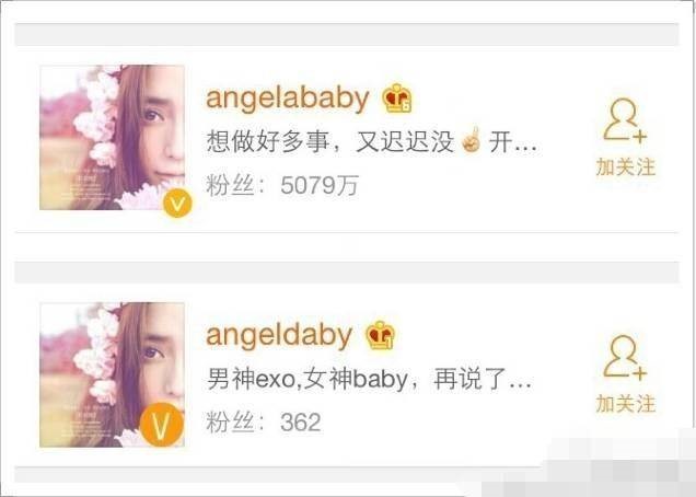 以angelababy为例,头像完全一致,甚至头像上的认证V也P上了,昵称只改动少许,乍一看,还真分不出来哪个是真。当然这些高仿号可能是出于对偶像的热爱,情不自禁,控几不住我记几。