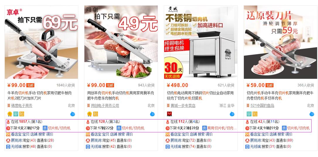 大家在选好产品之后,首先要去做的不是作图、上新,而是去数据分析。最简单的方法要去看两个数据,一是宝贝数、而是搜索指数。今天我们以我们分析出来的切片机举例,看下面数据: