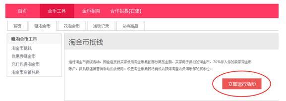 在赚淘金币里边,我们点击第一个淘金币抵钱,立即运行活动。